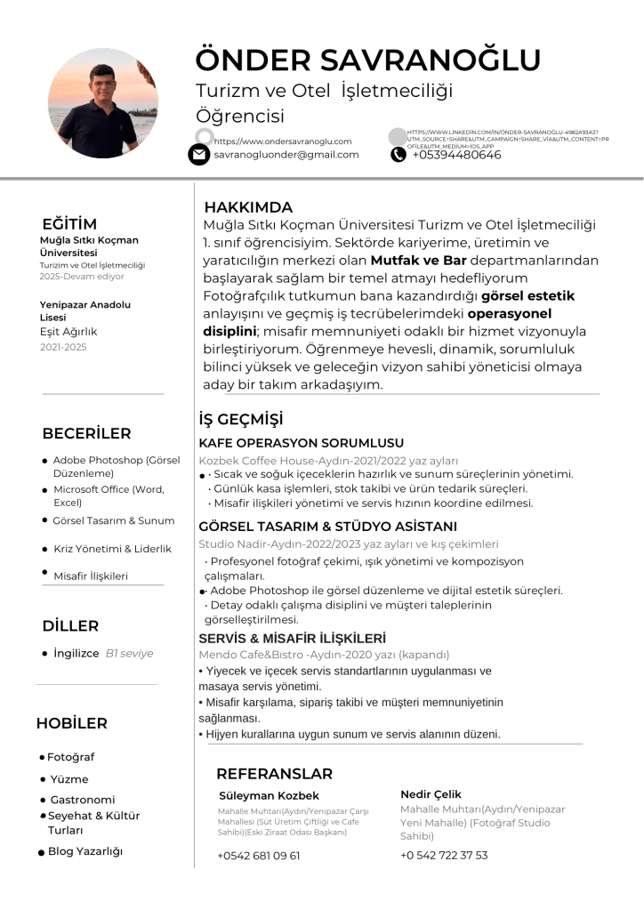 Turizm sektörüne, üretimin ve yaratıcılığın kalbi olan Mutfak veya Bar departmanlarında başlayarak, misafire sunulan hizmeti en temelden deneyimlemek istiyorum. İnsanlara yeni tatlar ve deneyimler sunmaktan keyif alıyorum. Uzun vadeli hedefim; operasyonel tecrübemi liderlik vasıflarımla birleştirerek, sektörde inisiyatif alan, vizyon sahibi bir Yönetici pozisyonuna erişmektir.