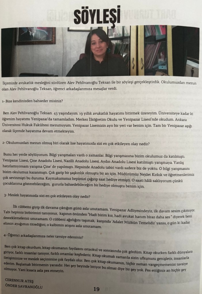 • Röportaj: İlçemizin avukatlarından Alev Pehlivanoğlu Teksan ile meslek hayatı üzerine bir söyleşi gerçekleştirdim.