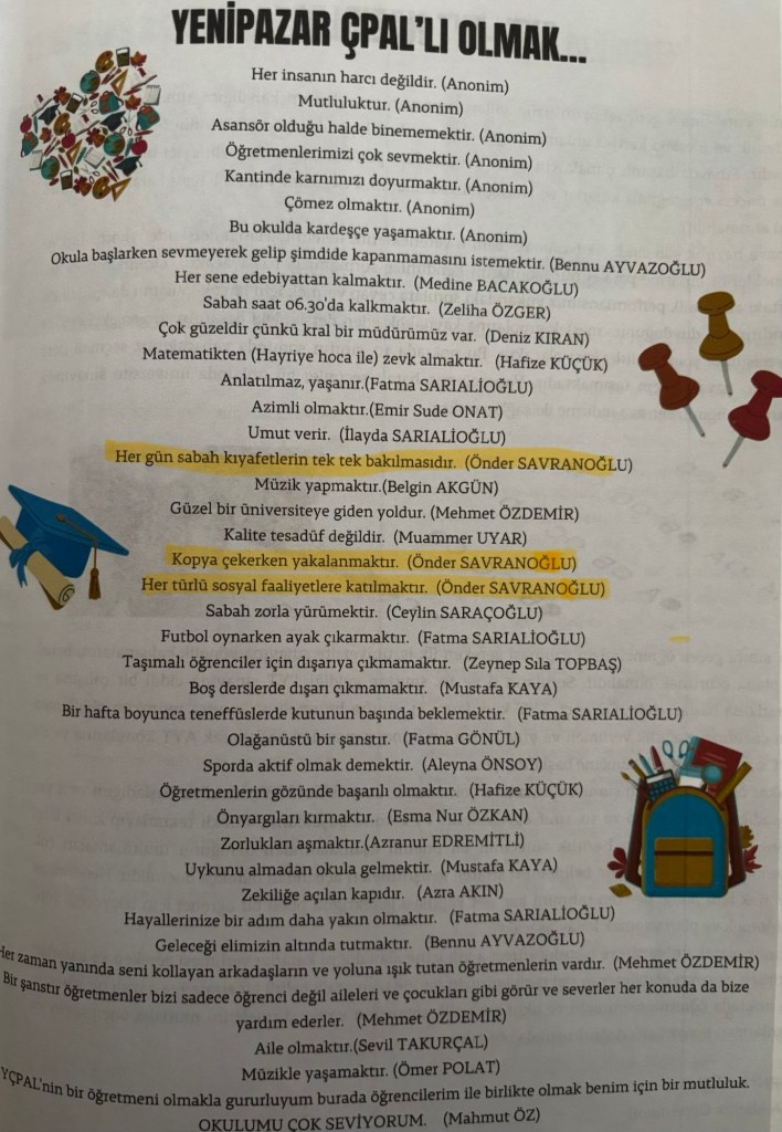 Lise yıllarımda (Yenipazar ÇPAL), derslerin yanı sıra sosyal faaliyetlerde de aktif olmayı severdim. Bu kapsamda, öğretmenlerimiz ve öğrenci arkadaşlarımızla bir araya gelerek okul dergimiz “İlk Adım”yayına hazırladık. Benim için hem keyifli bir anı hem de güzel bir sorumluluk örneğiydi.